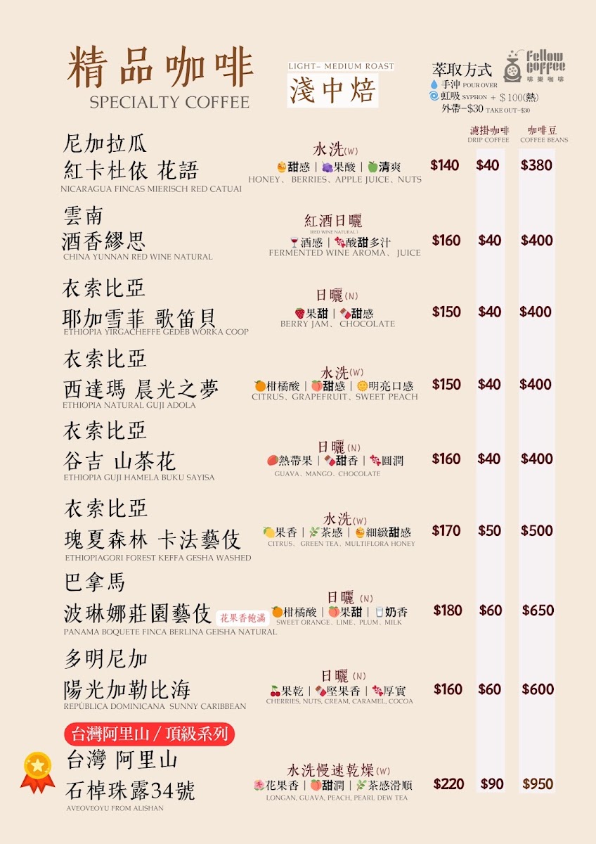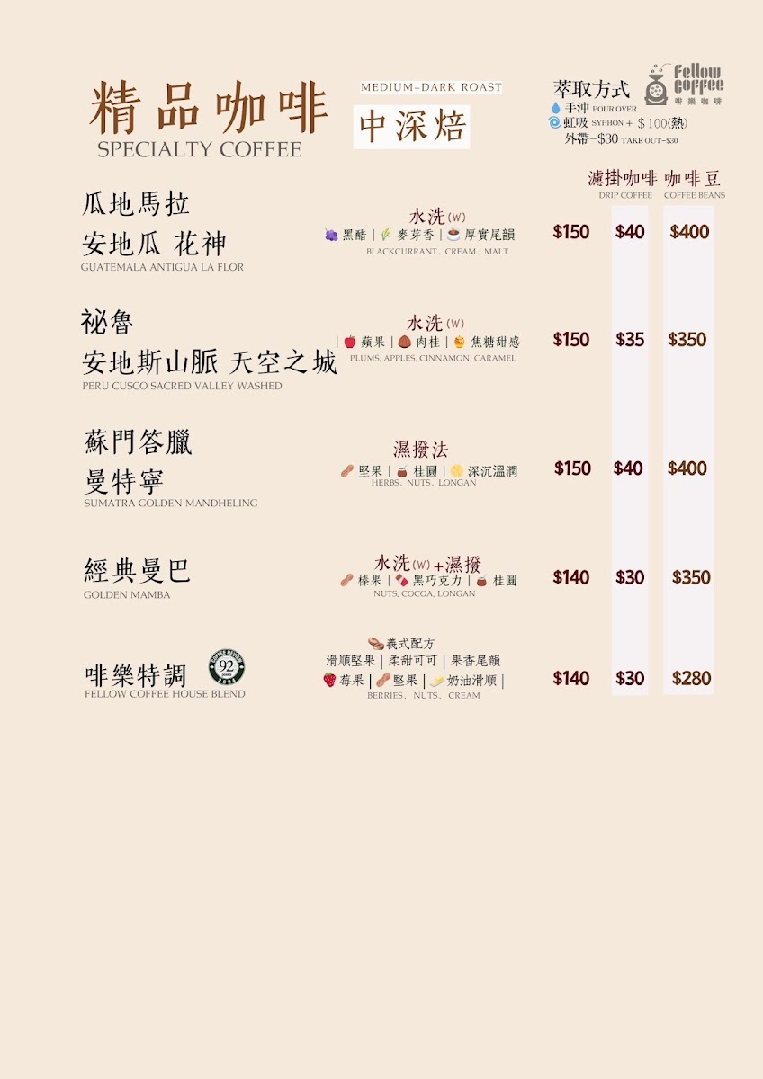 Welcome to Fellow Coffee 啡樂咖啡, an inviting café located in the heart of Taipei's Zhongshan District. With a focus on high-quality brews, their menu features an impressive selection of coffee offerings, including expertly crafted lattes and a standout pour-over experience, perfect for those who want to savor each sip. Customers rave about the rich and creamy mocha, a highlight that sets them apart in Southeast Asia.